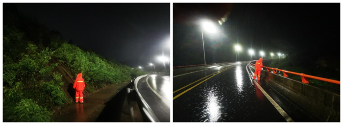 9月7日晚上,深圳市突降特大暴雨,嘉隆達龍崗3標立即啟動應急預案,集結(jié)應急處置人員25人,其中管理人員和巡查人員15人,保養(yǎng)工人10人;汽油抽水機2臺,發(fā)電機2臺;應急車輛4臺;其他應急物資準備充足。對管養(yǎng)范圍的道路、邊坡、橋梁等設(shè)施展開巡查,發(fā)現(xiàn)情況立刻按照應急預案處置。
