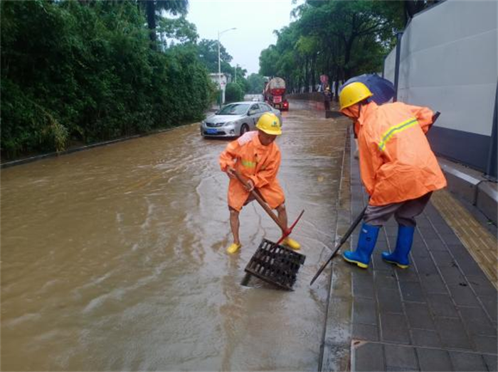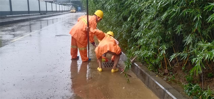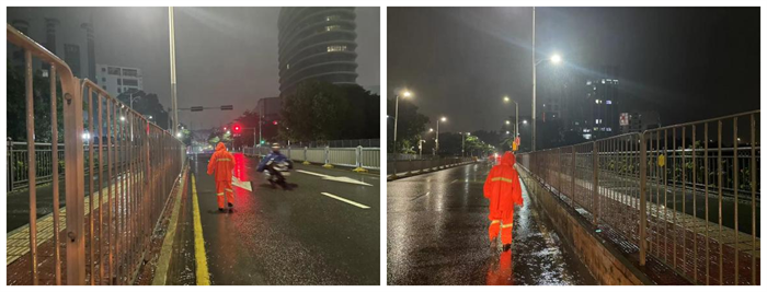 暴雨中,道路養(yǎng)護人員加強道路的巡查、及時清理倒伏路樹和障礙物,疏通排水口、加強對水浸點的值守和巡查。深圳市嘉隆達市政工程有限公司對轄區(qū)道路、邊坡、橋梁、等開展巡查工作,并安排專人24小時進行值守,做好危險路段管制準備。